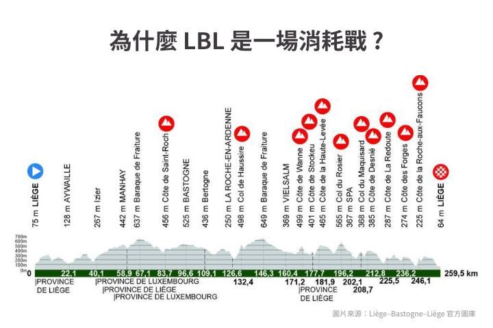它不像 Flèche Wallonne,把勝負集中在最後一坡;LBL 更像是一場長時間的篩選。